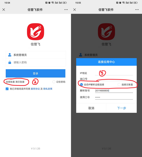 信管飛微信端登錄界面“選擇賬套”設置連接參數并選擇賬套。如果是本地版,選擇“動態IP解析遠程連接”,輸入IP解析賬號和使用口令;如果是云賬套版,選擇“連接云賬套”,輸入通行證帳號和密碼。》“使用動態IP解析通過互聯網遠程連接”。然后點擊“下一步”,選擇賬套。