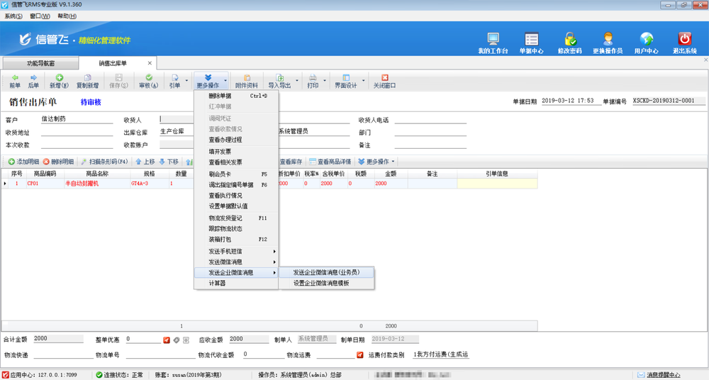微信消息參數(shù)設(shè)置完成后,新開一個(gè)業(yè)務(wù)單據(jù),錄入單據(jù)信息后點(diǎn)擊保存按鈕,然后在工具欄“更多操作”下選擇“發(fā)送企業(yè)微信消息”。系統(tǒng)會(huì)根據(jù)消息模板自動(dòng)生成消息內(nèi)容,點(diǎn)擊“確認(rèn)發(fā)送”會(huì)發(fā)送一條消息。