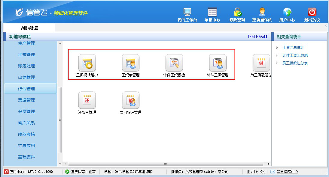 包括功能:工資模板維護、工資單管理、計件工資模板維護、計件工資管理、工資匯總統計、計件工資匯總表等。
