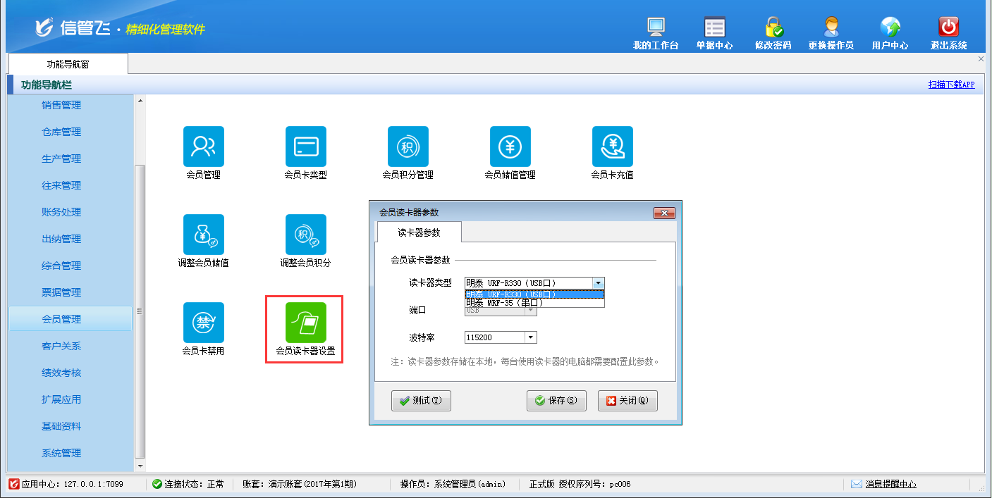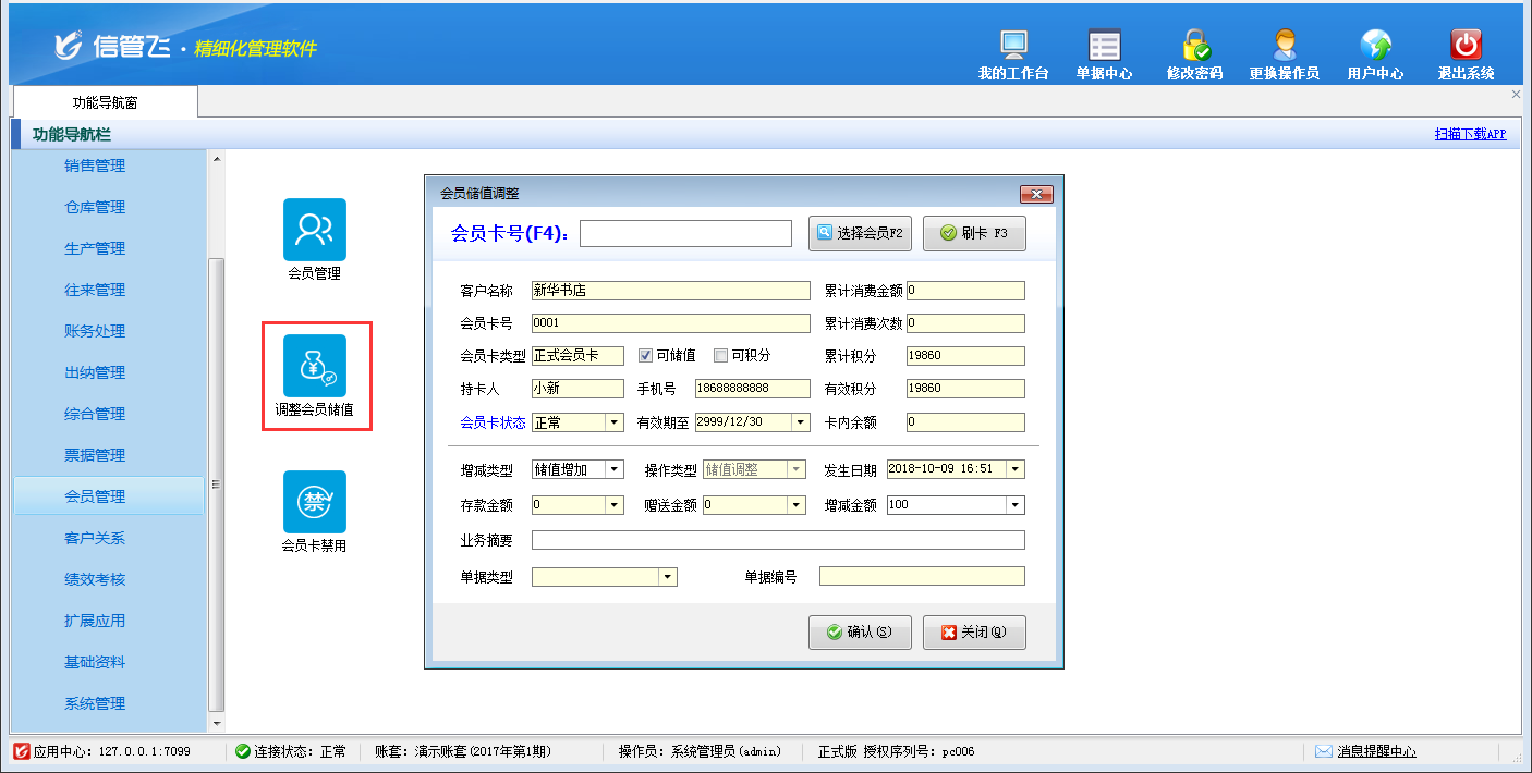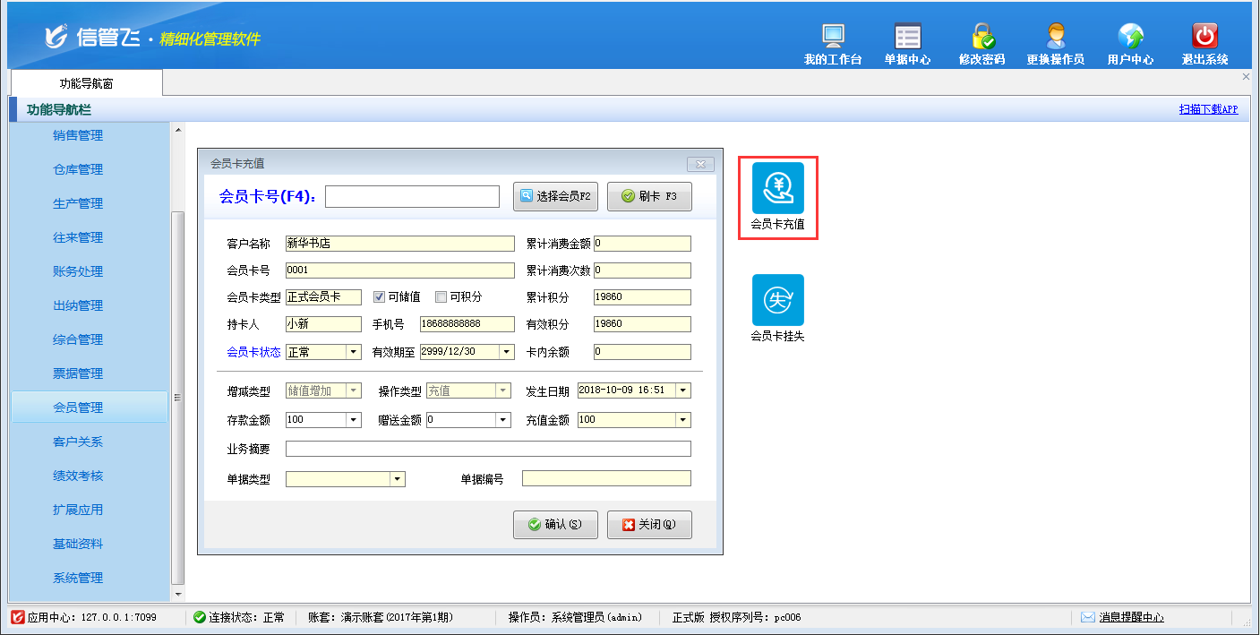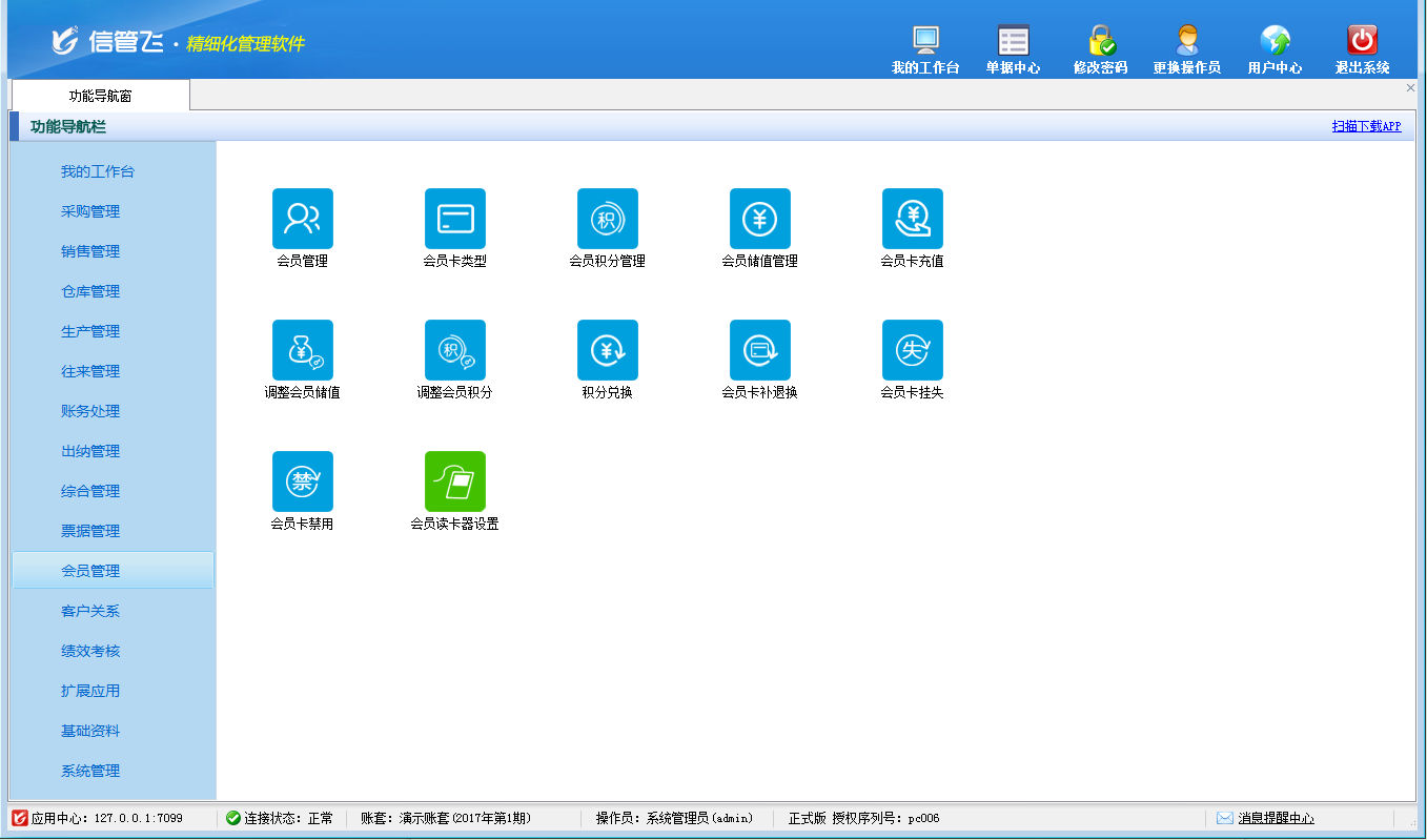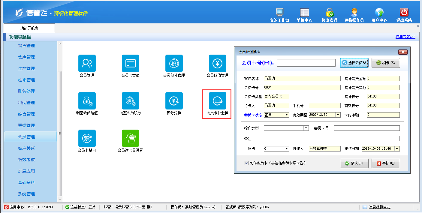 包括功能:會員卡類型維護(hù)、會員積分管理、會員儲值管理、調(diào)整會員儲值、調(diào)整會員積分、會員卡充值、積分兌換、會員卡補(bǔ)退換、會員卡掛失、會員卡禁用、會員讀卡器配置等。