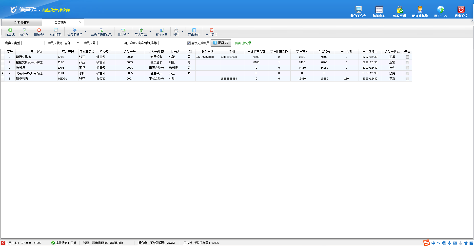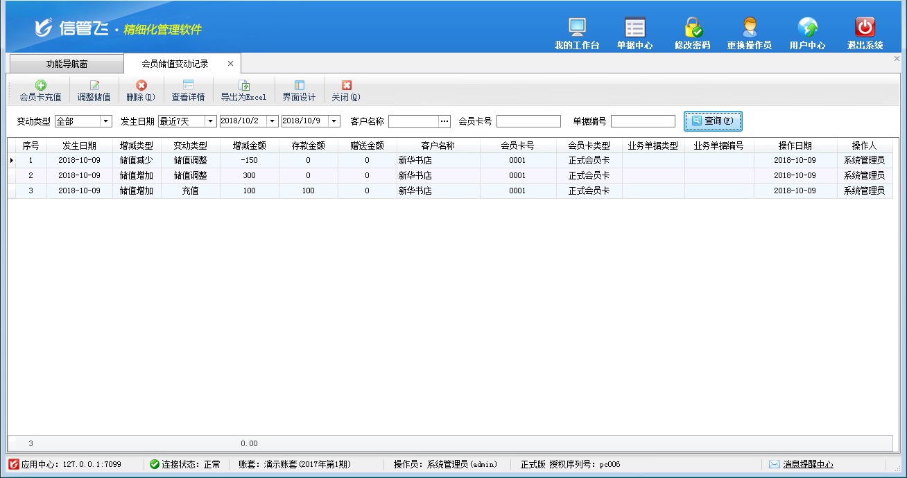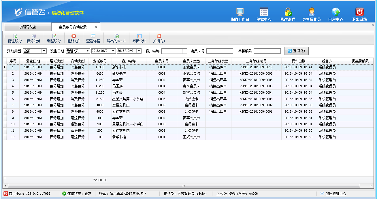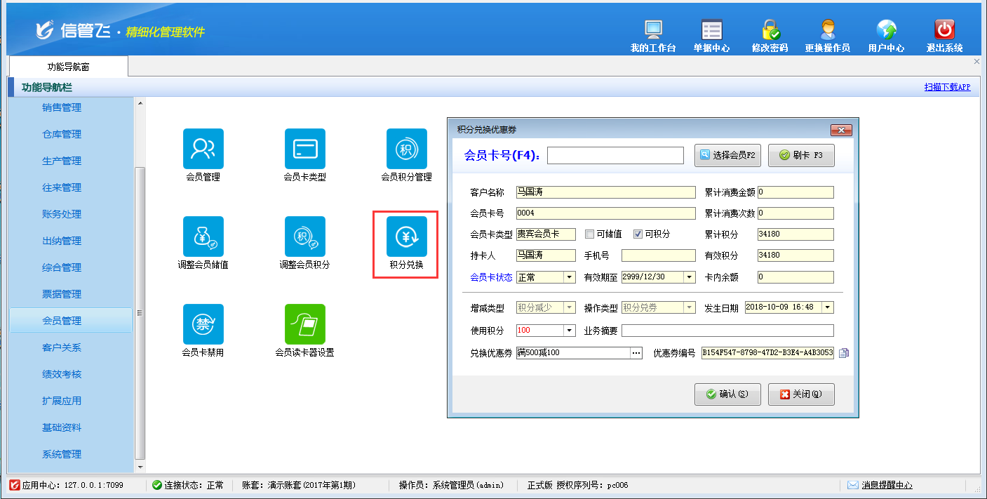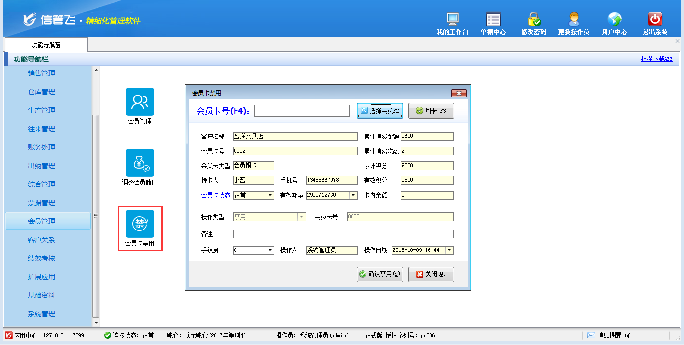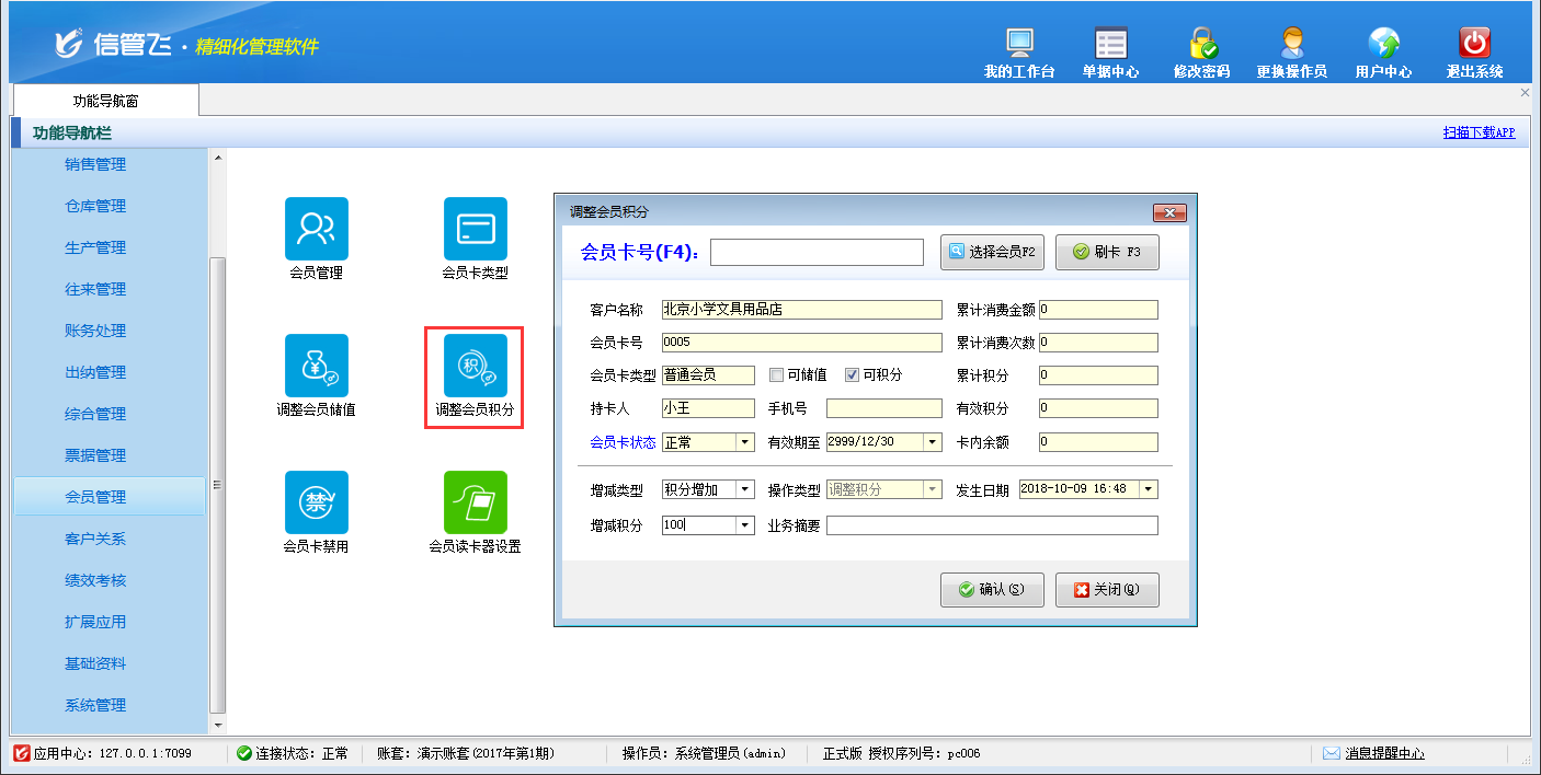 包括功能:會員卡類型維護(hù)、會員積分管理、會員儲值管理、調(diào)整會員儲值、調(diào)整會員積分、會員卡充值、積分兌換、會員卡補(bǔ)退換、會員卡掛失、會員卡禁用、會員讀卡器配置等。