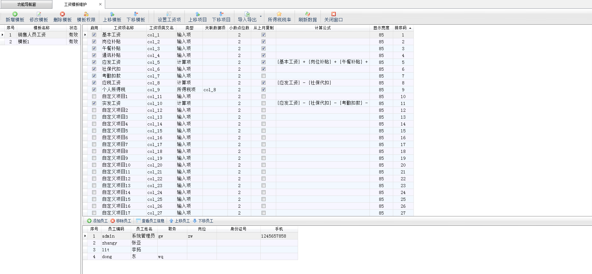 上移模板、下移模板:在工具欄點擊“上移模板”、“下移模板”可以調整工資模板的顯示順序。