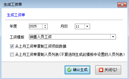 生成工資單:點擊“生成工資單”按鈕,可以彈出生成工資單窗口,在此窗口可以選擇年度、月份及相應的工資模板,然后點擊“確認生成”按鈕即可生成相應的工資單,另外也可以打勾選擇“從上月工資單復制工資項目數據”及“從上月工資單復制人員列表(不復選則生成工資發放模板中設置的相應人員的工資)”選項,打勾復選,本月的工資項目數據則可以復制上月的工資項目數據,不復選則不會復制上月的工資項目數據,如圖所示。