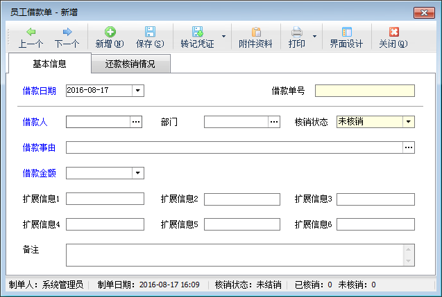 ????點擊“新增”按鈕可以在當前信息保存后不關閉窗口直接錄入下一個新的借款單。