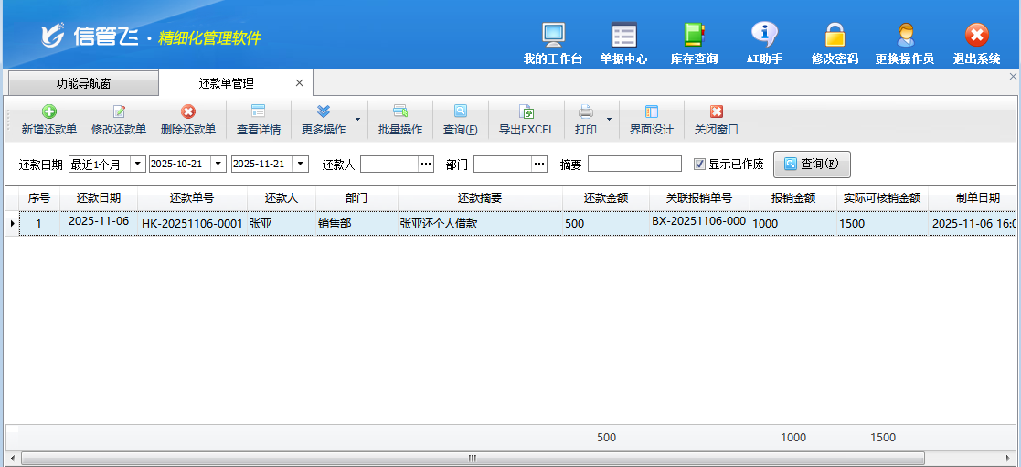 注:還款單管理可以增加費用報銷單來進行統一管理。