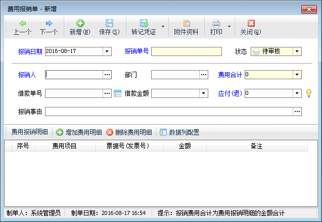 ????點擊“新增”按鈕可以在當前信息保存后不關閉窗口直接錄入下一個新的報銷單。