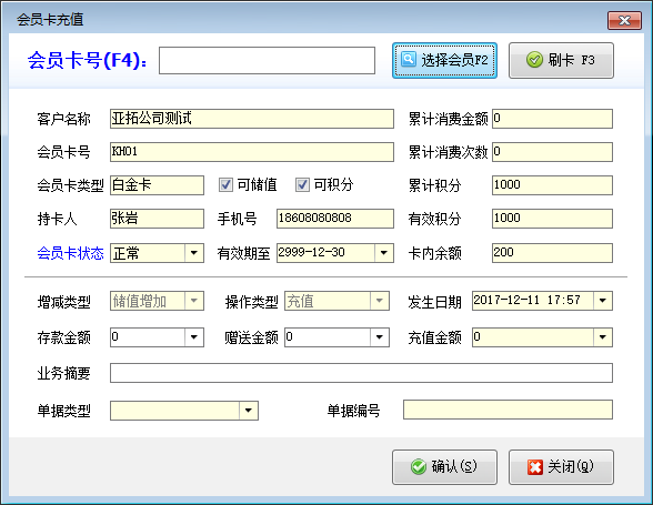 會員卡充值:在工具欄中點擊“會員卡充值”按鈕,可以打開“會員卡充值窗口,選擇會員后,可以對此會員卡進行充值,充值后卡內余額增加。