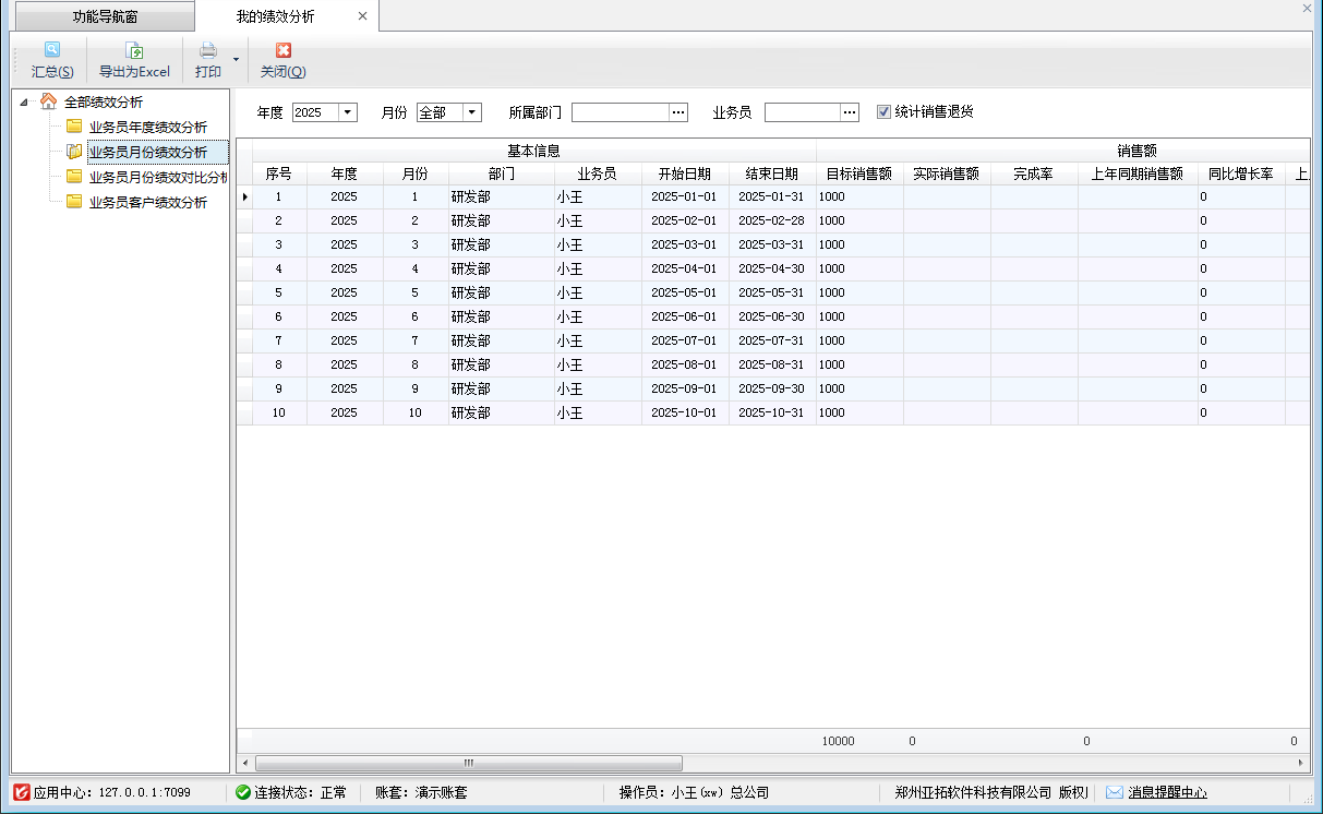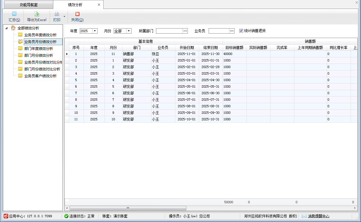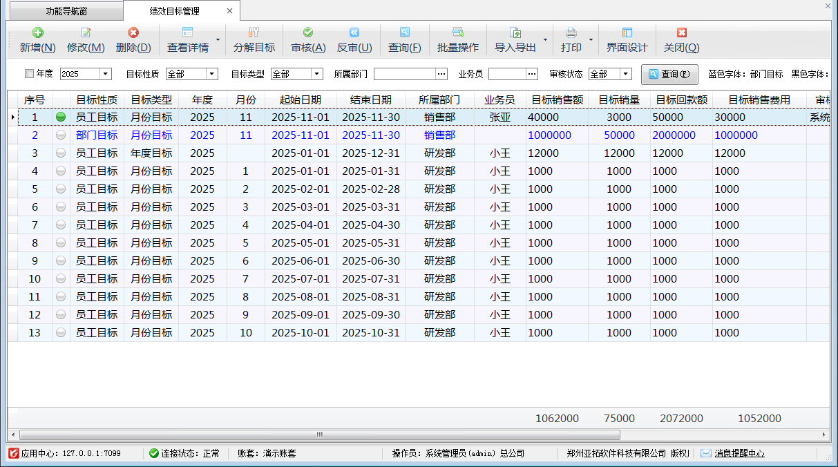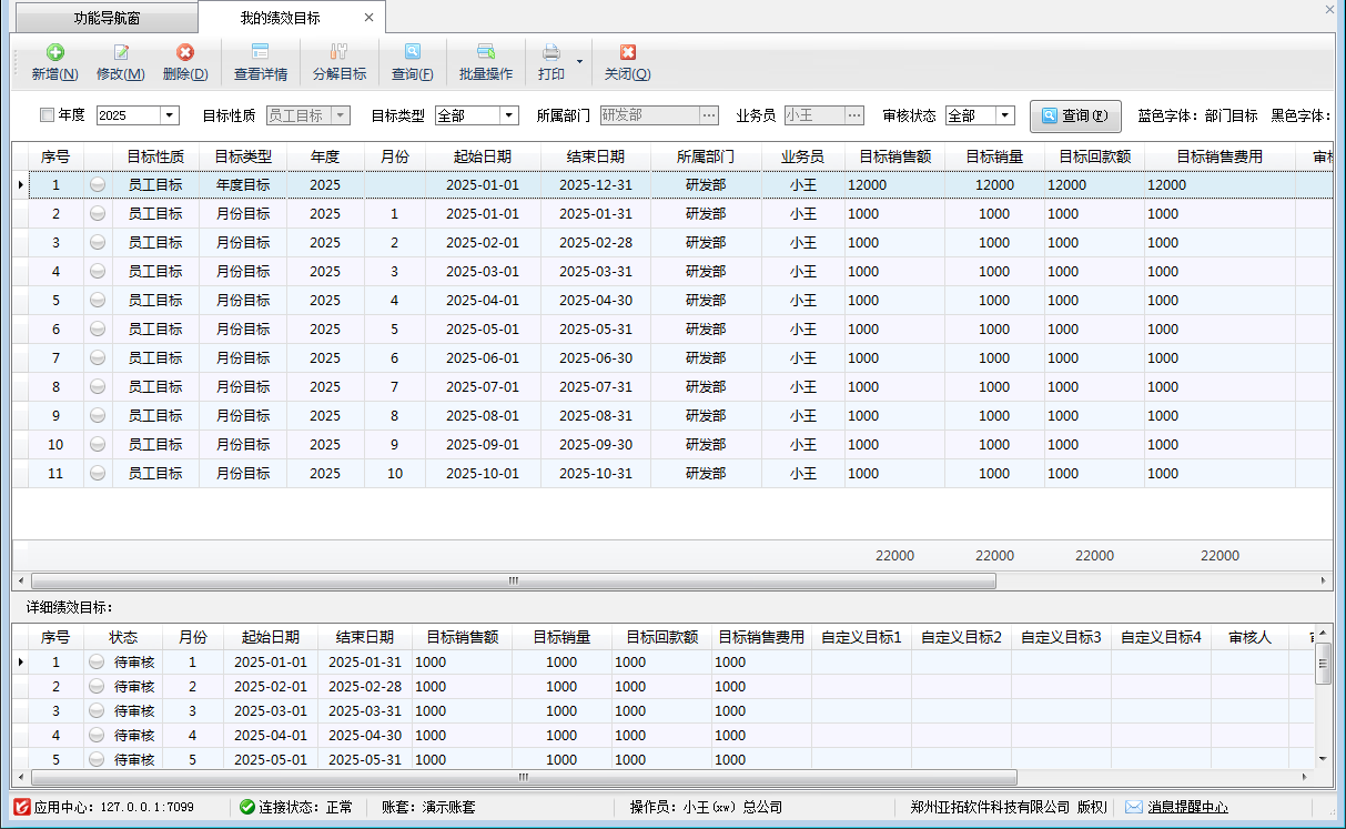 查詢:可以根據年度、目標性質、目標類型、部門、業務員及審核狀態等條件查詢績效目標記錄。