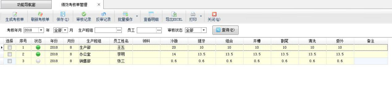 查詢:可以根據考核日期、生產班組、員工、審核狀態等條件查詢考核單記錄。