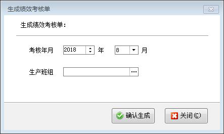 生成績效考核單:點擊“生成考核單”按鈕,可以彈出生成績效考核單窗口,在此窗口可以選擇年度、月份及相應的生產班組,然后點擊“確認生成”按鈕即可生成相應的績效考核單,如圖所示: