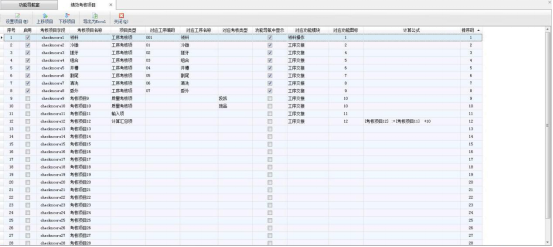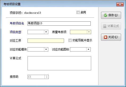設置考核項目:在工具欄點擊“設置項目”,可以打開“考核項目設置”界面,可以設置考核項目名、項目類型(工序考核項、質量考核項、輸入項、計算匯總項)及考核項目否需要在功能導航中顯示等。如下圖所示: