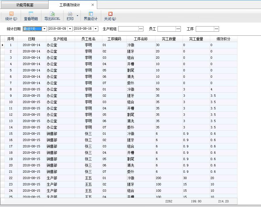 統計:可以根據日期、生產班組、員工、工序等條件對工序績效進行統計。