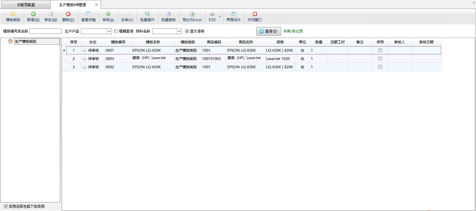 審核:點工具欄中的“審核”按鈕,可以對“待審核”的生產模板進行審核,已審核的生產模板不允許隨意修改,如需修改清先進行反審。