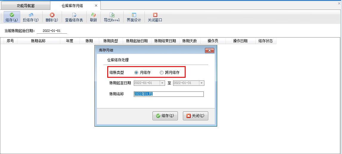 ????庫存月結功能支持按月或者跨月多業務進行結存操作,如下圖所示: