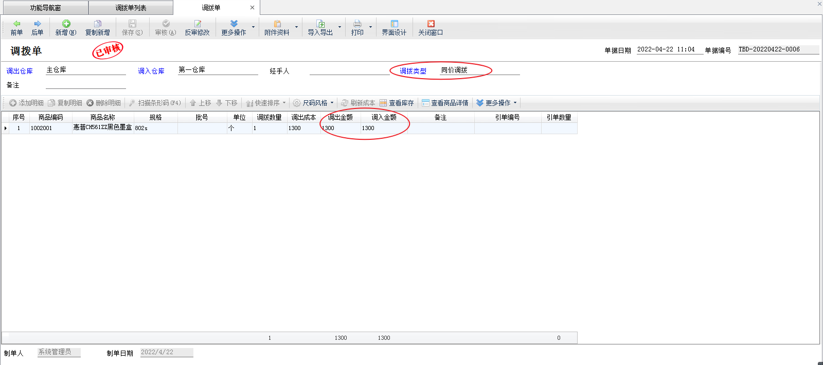 ????② 選擇調撥類型后,下面的單據明細會自動切換需要輸入的數據項(調入單價、調入金額、調撥差額)。