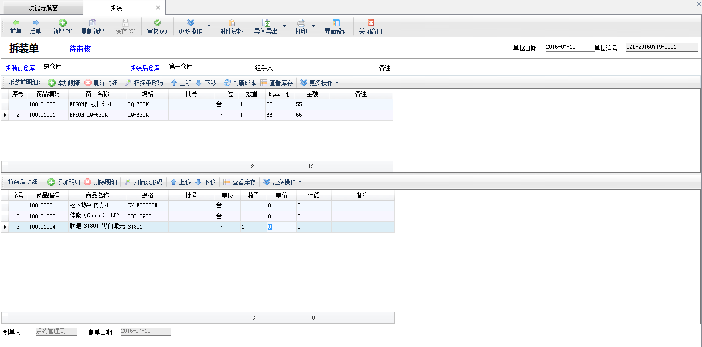 ????單據上方為“拆裝前商品明細”其相應的商品將會出庫(即庫存數量會減少),單據下方為“拆裝后商品明細”其相應的商品將會入庫(即庫存數量會增加)。