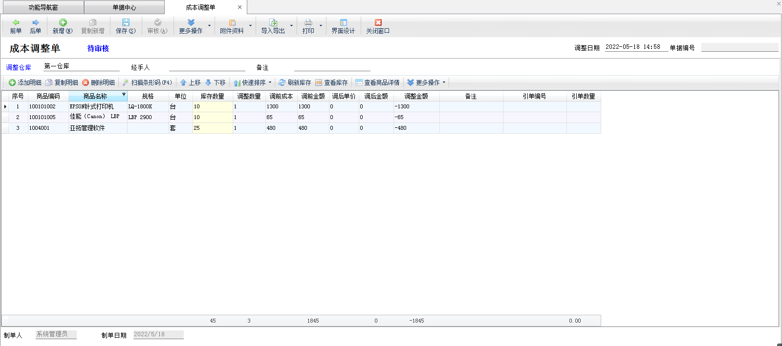 ????本軟件支持負庫存開單,如果商品不存在成本價會提示錄入成本價,實際工作中有可能會出現錄入錯成本價的情況,導致最終在倉庫庫存查詢中發現商品成本價異常。此外,在業務經營中也需要進行優惠性調價(節日或促銷活動調價)、季節性商品調價、政策性商品調價等。這些業務都可以通過“成本調整單”進行價格調整。