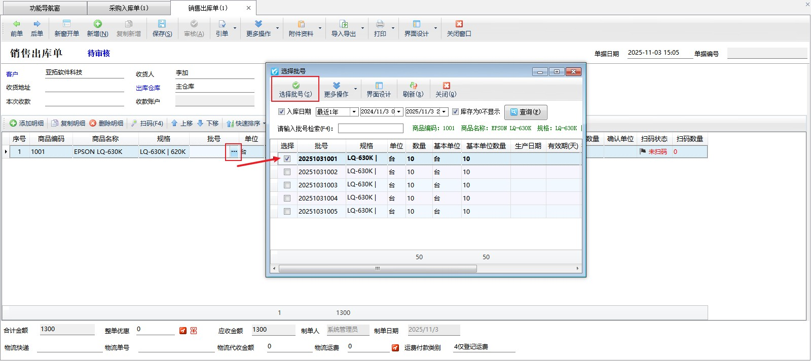 ????以銷售出庫單為例:在功能導航窗點“銷售管理”—》“銷售出庫單”即可進入“銷售出庫單”界面,點擊“添加明細”選擇批號商品時,會彈出選擇批號界面,勾選出庫的批號。如下圖所示:
