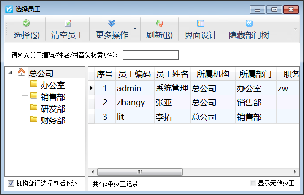 ????在選擇員工窗口,可以在輸入框中輸入人員的姓名或者拼音碼(即拼音頭)進(jìn)行檢索。選擇查找到的人員,然后點(diǎn)擊“選擇”按鈕,或者直接雙擊記錄即可。