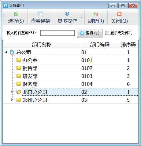 所屬部門:非必填項(xiàng),選擇員工后,系統(tǒng)自動(dòng)會(huì)填寫入該員工的部門。如需要修改,請(qǐng)點(diǎn)擊“選擇部門”按鈕,系統(tǒng)彈出“選擇部門”窗口,如下圖所示: