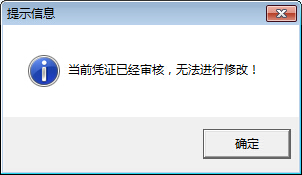 ????選擇一個(gè)憑證,然后點(diǎn)擊工具欄中的“修改憑證”按鈕,如果該憑證已審核,則系統(tǒng)不允許修改,彈出如下的提示信息: