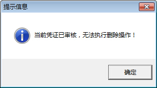 ????選擇一個(gè)憑證,然后點(diǎn)擊工具欄中的“刪除”按鈕,如果該憑證已審核,則系統(tǒng)不允許刪除,彈出如下的提示信息: