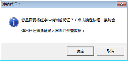 ????選擇一個(gè)憑證,然后點(diǎn)擊工具欄中的“更多操作”—》“紅字沖銷”按鈕,系統(tǒng)彈出提示信息,點(diǎn)“確定”按鈕,系統(tǒng)彈出沖銷憑證信息錄入窗口: