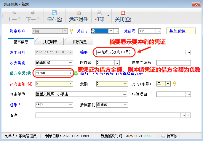 ????如果已審核的憑證確實(shí)有誤,可以點(diǎn)擊“更多操作”—》“紅字沖銷”按鈕,進(jìn)行沖銷,詳細(xì)操作見下面的描述。