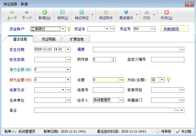????在新增或修改憑證時(shí),系統(tǒng)支持“轉(zhuǎn)記憑證”功能,用于處理存款、取款、轉(zhuǎn)帳等涉及多個(gè)帳戶的憑證錄入,方便用戶操作,減少重復(fù)錄入。
