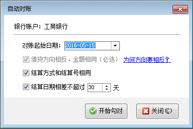 ????在工具欄中點(diǎn)擊“自動(dòng)對(duì)賬”按鈕,系統(tǒng)彈出“自動(dòng)對(duì)賬”窗口,選擇對(duì)賬起始日期及相關(guān)選項(xiàng)后,點(diǎn)擊“開始勾對(duì)”按鈕即可,如下圖所示: