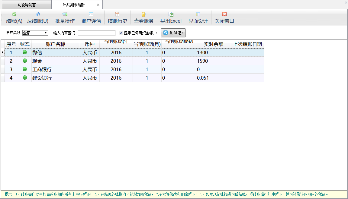 | 3 | 反結(jié)帳 | 在帳戶列表中,選擇已結(jié)帳的帳戶,點(diǎn)擊工具欄中的“反結(jié)帳”按鈕即可返回至上一賬期。 |