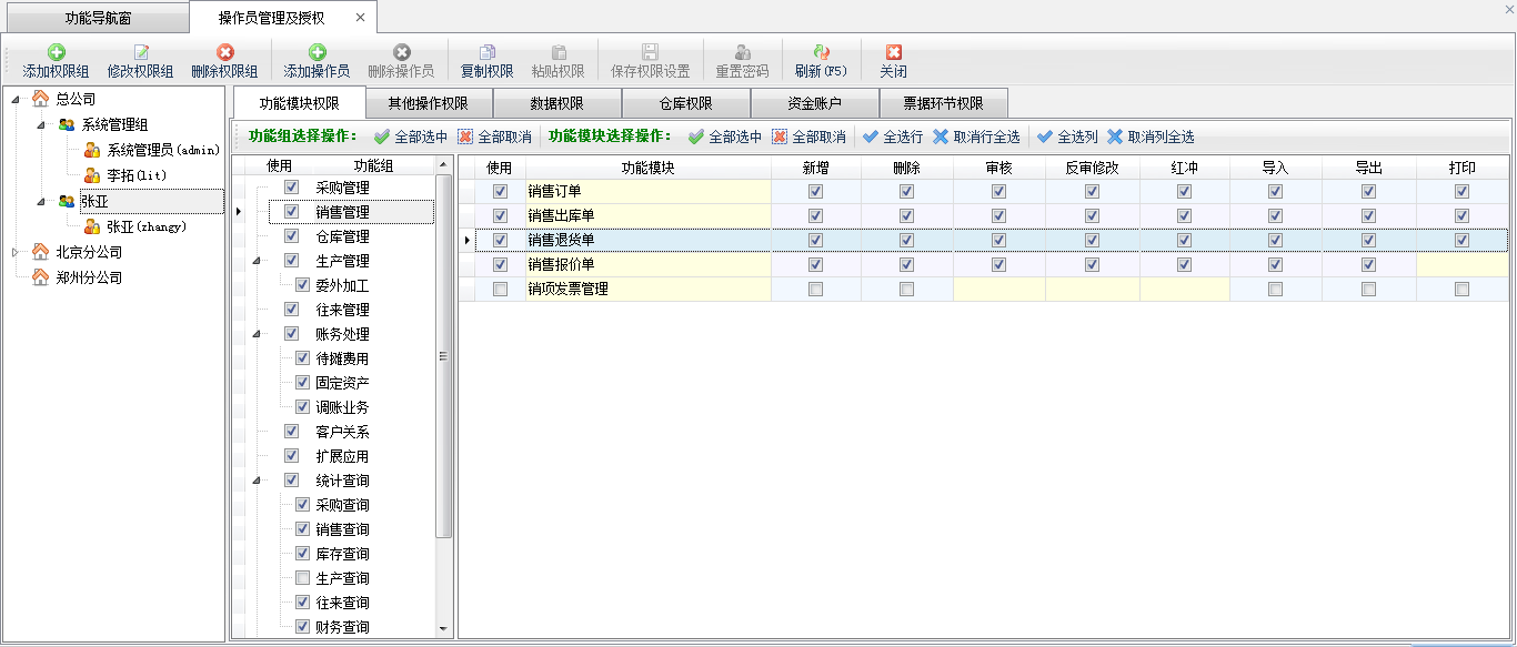 ????(1)設(shè)置功能模塊權(quán)限的時候,注意打勾選擇“使用”后,還需要設(shè)置詳細(xì)的操作權(quán)限(如新增、刪除、審核、反審修改、紅沖、導(dǎo)入、導(dǎo)出、打印等),如果不設(shè)置詳細(xì)的模塊操作權(quán)限,則只能進(jìn)入功能模塊,但無法執(zhí)行任何操作。