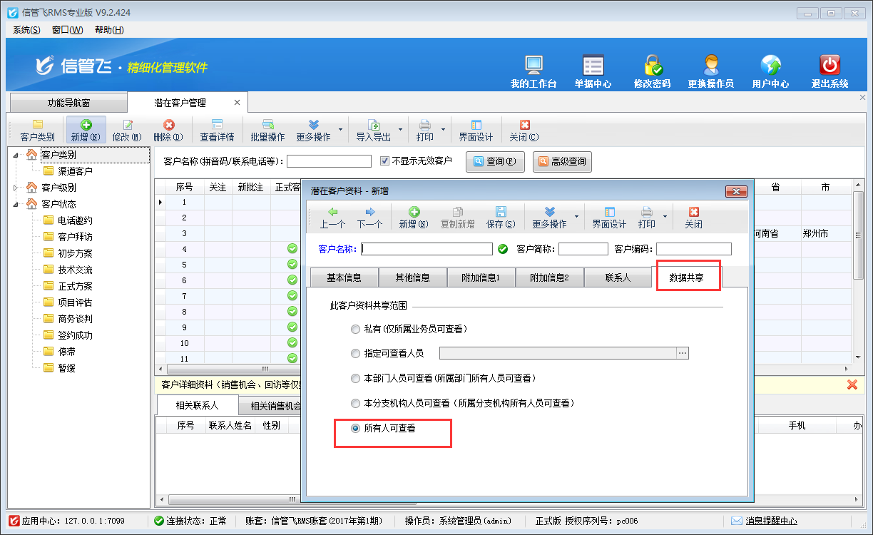 ????指定可查看這個潛在客戶信息的人員,除錄入人和指定的可查看人員外,其他人無法查看到此潛在客戶信息。