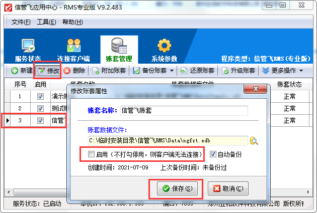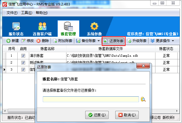 ????亞拓軟件旗下的信管飛RMS、信管飛倉庫管理軟件、信管飛送貨單軟件、信管飛出納記賬軟件、信管飛票據打印軟件等新架構程序軟件安裝后會顯示兩個圖標,一個是應用中心程序(紅色圖標),一個是客戶端程序(藍色圖標)。這些軟件都含有賬套管理功能,在應用中心里面可以建立多個賬套,已使用的帳套如果不再繼續使用,可以停用帳套,停用帳套后,客戶端程序登錄時無法連接該帳套。我們以信管飛RMS為例演示一下如何停用帳套。