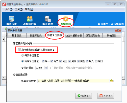 ????本文以信管飛倉庫管理軟件為例,介紹下如何修改賬套備份存儲目錄,打開應用中心程序(紅色圖標),點擊“系統參數”進入參數設置界面,選擇“賬套備份參數”,在賬套備份目錄設置中,可以修改默認目錄,如下圖所示: