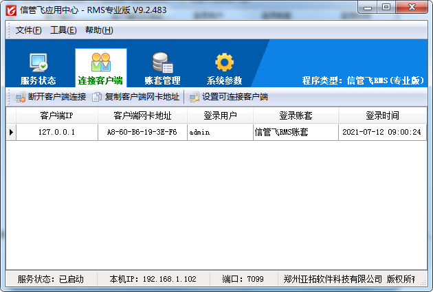 ????信管飛RMS、信管飛倉庫管理軟件、信管飛出納記賬軟件、信管飛送貨單軟件和信管飛票據打印軟件都由客戶端程序和應用中心程序兩部分組成,應用中心可以全面掌控軟件的運行情況,可以隨時查看各類服務的運行狀態,主要包括軟件授權服務情況、數據庫引擎服務情況、動態IP解析服務情況、手機短信服務情況等。下面我們以信管飛RMS專業版為例介紹一下應用中心的服務狀態。