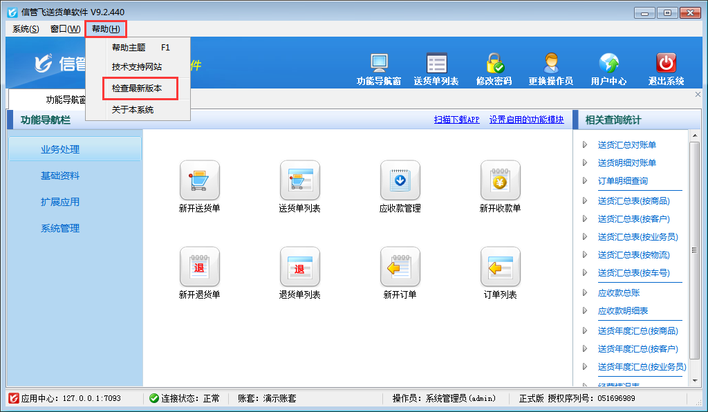 ????本文我們以紅管家送貨單軟件為例,截止到本文發布日期,紅管家送貨單軟件最新版是V8.5.217版本,我們以V8.5.210版本為例介紹下軟件聯網檢查最新版的兩種方法。