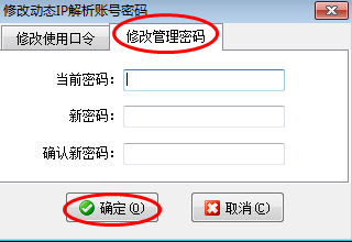 ????在修改密碼窗口,點擊“修改管理密碼”頁面,輸入當前密碼、新密碼、確認新密碼后,點擊“確定”按鈕,就可以修改動態IP解析服務的管理密碼。如下圖所示: