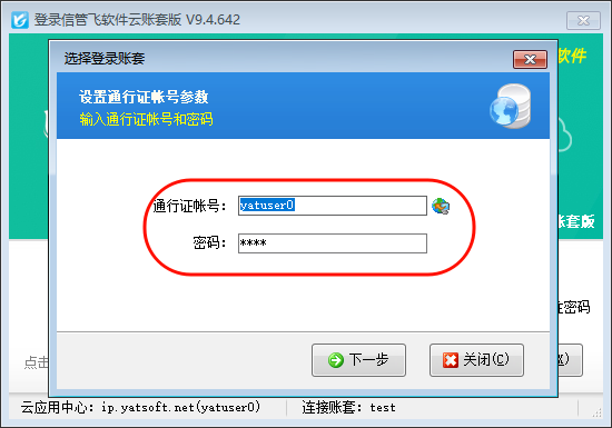 ???? 云賬套模式購買后會分配云賬號和密碼,軟件直接打開客戶端程序,點擊“選擇賬套”進入模式選擇界面,輸入賬號和密碼,點擊下一步新增賬套,如下圖所示: