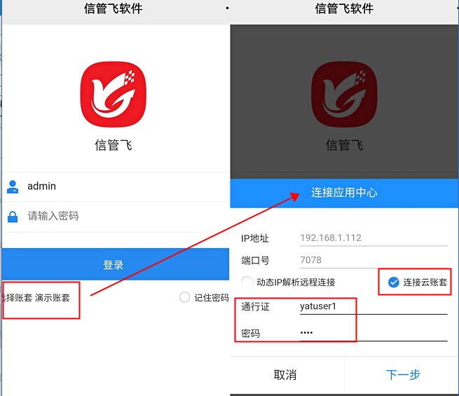 ????手機APP登錄前提需要在電腦客戶端程序新增好賬套,APP登錄界面點擊“選擇賬套”,在彈出的界面。勾選“連接云賬套”,輸入賬號和密碼。點擊下一步選擇賬套進行登錄軟件,如下圖所示: