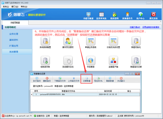 ????本文以信管飛送貨單軟件為例,介紹一下云賬套模式如何上傳本地試用數據備份文件,并還原本地備份數據?
