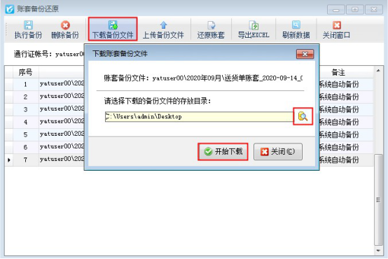 ????在“賬套備份還原”界面,選擇最近日期的備份文件,點擊“下載備份文件”,選擇存放備份文件目錄,點擊“開始下載”,下載完成會提示已下載,點擊確定后可在存放目錄中查看到下載的備份文件,如下圖所示: