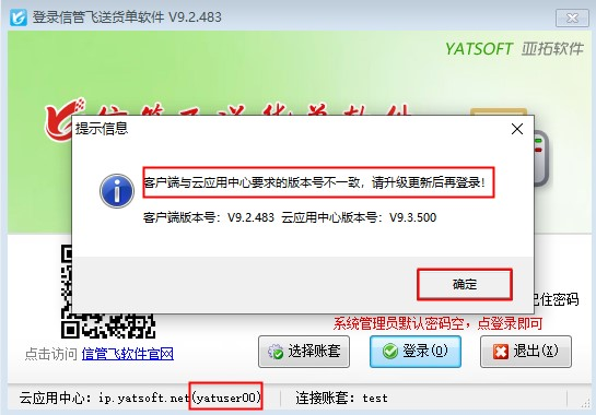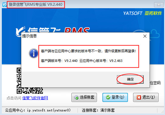 ????有用戶登錄云賬套時,系統提示“客戶端與云應用中心要求的版本號不一致,請升級更新后再登錄!”如下圖所示,登錄時之所以會提示升級版本,是因為亞拓軟件自主研發的軟件是不斷升級優化的,發布新版本后,云賬套模式的客戶端需要和云應用中心的版本一致才可以登錄,下面我們以信管飛RMS專業版為例,介紹下如何升級到最新版本軟件?