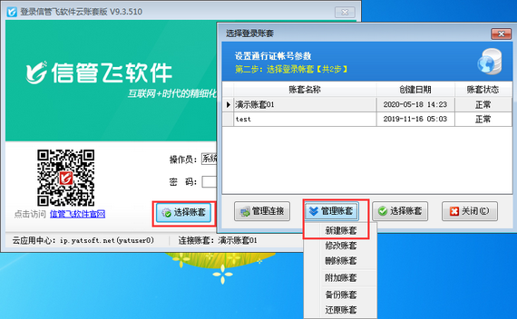 ????在云賬套登錄界面,點擊“選擇賬套”,打開“選擇登錄賬套”界面,點擊“管理賬套”—》“新建賬套”,新建一個空賬套,并選擇新建的賬套進行登錄。