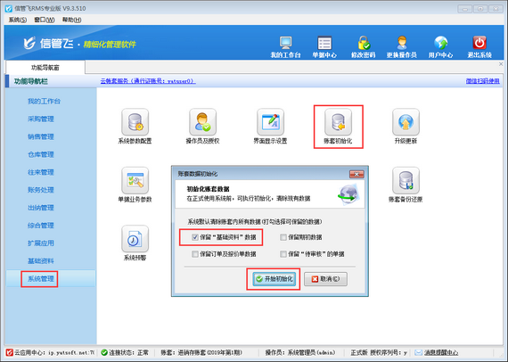 ????最后,賬套還原成功后,重新登錄新建的賬套,打開基礎資料可以看到之前賬套的基礎資料信息已全部還原到新建的賬套,如果之前賬套備份存在單據信息,可以在“系統管理”—》“賬套初始化”中進行僅保留基礎資料的初始化操作,如下圖所示: