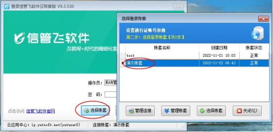 ????打開云賬套登錄界面,點擊“選擇賬套”,繼續點擊下一步進入選擇登錄賬套界面,如下圖所示: