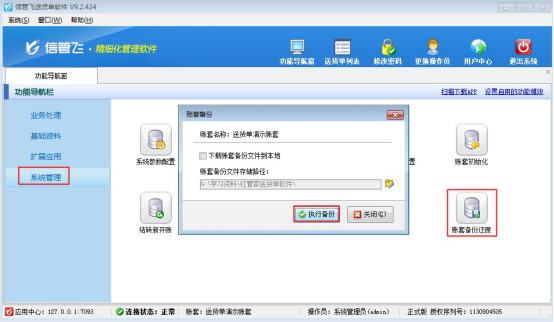 ????信管飛送貨單軟件、信管飛RMS軟件、信管飛出納記賬軟件等都支持網絡版和單機版,網絡版本默認需要固定一臺電腦作為主機電腦,需打開紅色應用中心程序,客戶端電腦安裝客戶端程序,默認需要局域網下連接主機電腦紅色應用中心ip地址,紅色應用中心程序可操作賬套新增以及備份還原等,為避免主機忘記備份,客戶端電腦可直接在客戶端程序上進行執行備份操作以及可下載備份文件到本地,本文以“信管飛送貨單軟件”為例,示范下客戶端電腦如何執行備份及下載備份到本地。