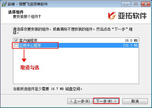 ????主機電腦需要安裝應用中心程序和客戶端程序,客戶端電腦只需要安裝客戶端程序即可。以“送貨單軟件為例”示范下如何安裝客戶端電腦程序,在客戶端電腦下載好安裝程序后,直接打開安裝,點擊“下一步”到“選擇組件”時,把應用中心程序取消勾選,只安裝客戶端程序,如下圖所示: