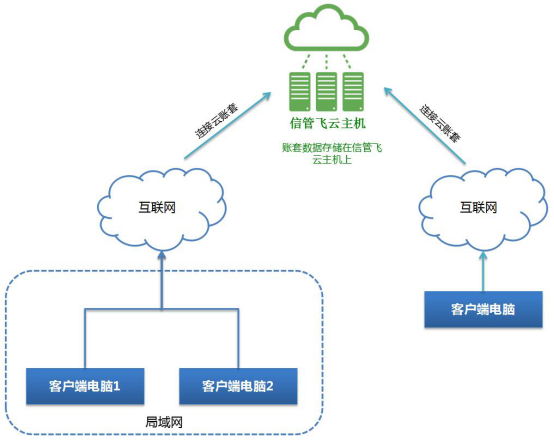 數據存儲在云端,為云賬套模式。云賬套模式無需準備主機(服務器)電腦,數據自動云端存儲,購買后分配云賬套賬號,任何一臺電腦安裝軟件,即可使用云賬套賬號連接云端登錄,只要電腦可以上網,就可以登錄軟件,可隨意更換電腦,數據是自動同步的。