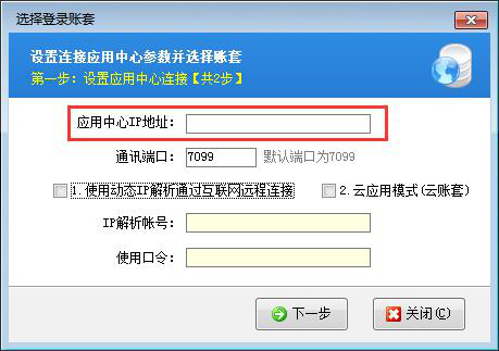 ????在客戶端程序登錄窗口點擊“選擇賬套”,輸入自購的云主機IP地址,點擊“下一步”后進入選擇賬套界面,選擇需要登錄的帳套即可,如下圖所示: